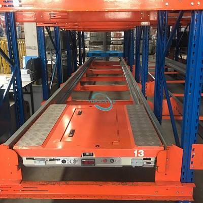 Pallet Shuttle Racking, usually, we always compare it with the drive-in racking system, which need the forklift operator goes into the racking area to load/unload the pallets, the pallet shuttle warehouse automation system, on the contrary, just need the forklift operator send the pallets to the shuttle car, then, the shuttle car will load the pallets into the deep lane one by one automatically, the laser on the shuttle car can find the exact location to put the pallets by itself. The Radio/Video Shuttle Racking system, not just save space (the depth of the rail can be 20m-50m, that is around 50 pallets position in the depth lane), and with no aisle between the channels, greatly improved the productivity and efficiency, the shuttle car can run 60m/min without loading, 42-48m/min with loading. As the good structure design, no need many extra maintain to the whole system, damage to the system also decreased greatly. Lots of the advantages of the shuttle racking system make it a good choice for you.